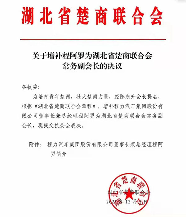 “虎威熠熠踏征程,八面來風共聚首”,程阿羅總經(jīng)理作為省青企聯(lián)會長暨湖北省楚商聯(lián)合會常務(wù)副會長,由于其掌舵的程力汽車集團在中國專汽行業(yè)所作出的突出貢獻,特別是2021年在疫情反復(fù)肆掠,各種自然災(zāi)害和國際國內(nèi)市場震蕩低迷等不確定因素疊加效應(yīng)影響下,程力集團萬眾一心攻堅克難,全年完成87億專汽產(chǎn)值,仍保持了2位數(shù)的百分比增幅,在全省“緩復(fù)蘇、補損失”的大環(huán)境下,保持了穩(wěn)健的發(fā)展勢頭,應(yīng)邀出席了湖北省年度經(jīng)濟工作會議,聆聽了湖北省委應(yīng)勇書記和王忠林省長的發(fā)言和工作報告,積極為湖北經(jīng)濟發(fā)展建言獻策。